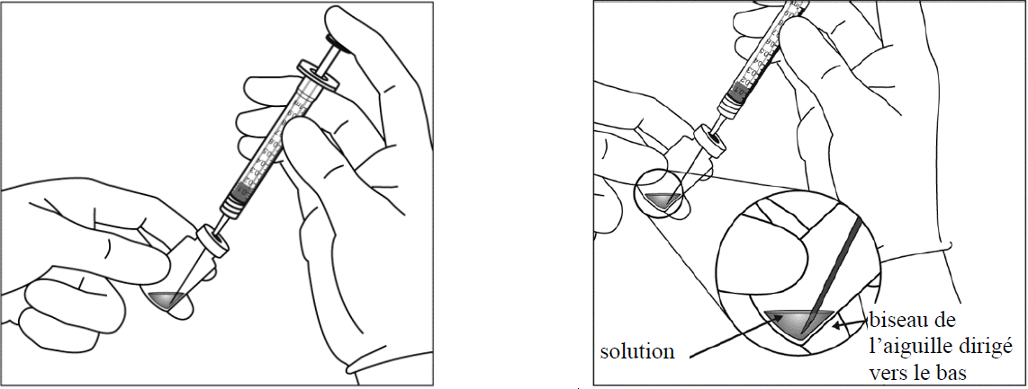 | 6. | Veiller à tirer suffisamment la tige du piston lors du prélèvement du contenu du flacon de manière à totalement vider l'aiguille à filtre. Après l'injection, tout produit non utilisé doit être éliminé. | |