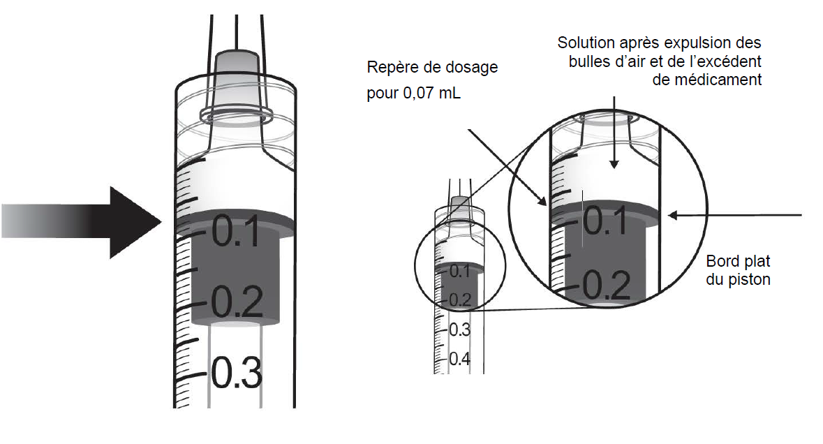 | 10. | Pour éliminer toutes les bulles et expulser l'excédent de médicament, appuyer lentement sur le piston de telle manière que le bord plat du piston soit aligné avec le repère qui indique 0,07 mLsur la seringue. |